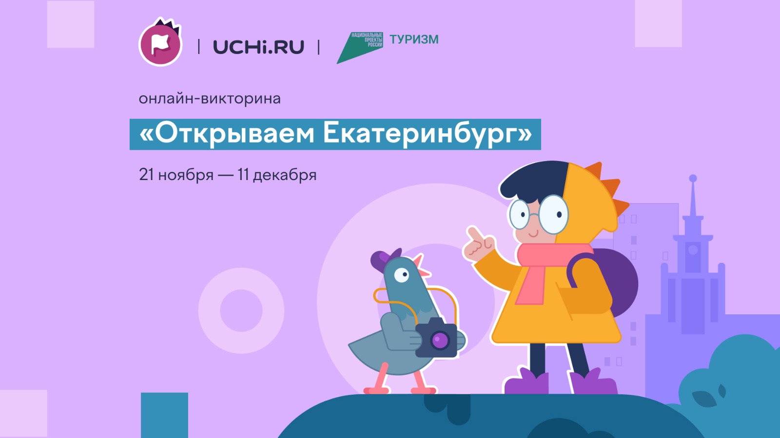 04.12.2023С 21 ноября по 11 декабря 2023 года на образовательной платформе Учи.ру проходит всероссийская онлайн-викторина «Открываем Екатеринбург» для учеников 1–9 классов. Викторина реализована при поддержке национального проекта «Туризм и индустрия гостеприимства», Министерства образования и молодёжной политики Свердловской области, Министерства культуры Свердловской области, Администрации города Екатеринбурга, Департамента образования Администрации города Екатеринбурга, Управления культуры города Екатеринбурга совместно с Музеем истории Екатеринбурга. К онлайн-викторине можно присоединиться на сайте платформы Учи.ру. Ученики, прошедшие викторину, получат дипломы, грамоты или сертификаты. Награды будут доступны в личных кабинетах на следующий день после завершения соревнования.